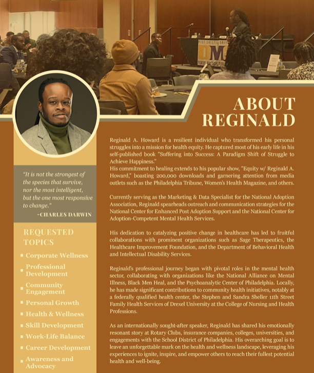 With a message rooted in resilience, vulnerability, and truth, Reginald creates space for honest conversations about mental health. His keynotes and workshops challenge stigma, foster emotional literacy, and inspire personal transformation.